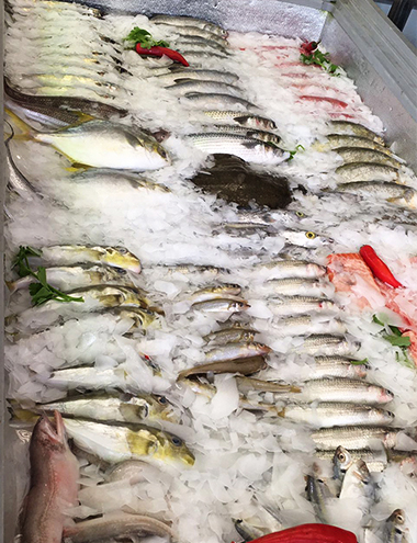 在海鮮市場主要在海鮮上鋪一層冰,是海鮮溫度降低,起到保鮮作用